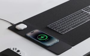 Description: A desk pad that doubles as a wireless charger keeps phones powered without adding clutter. It also defines your workspace visually — helping you stay anchored.
